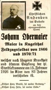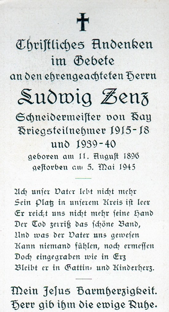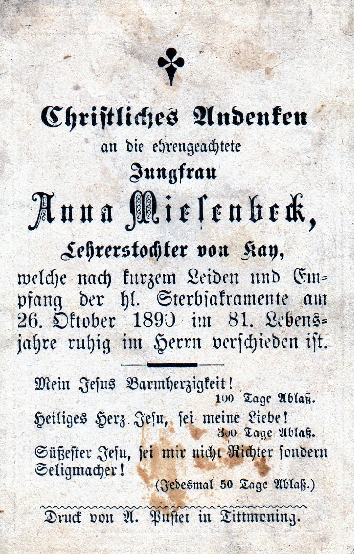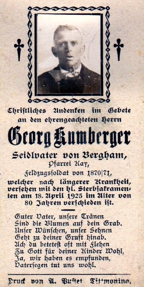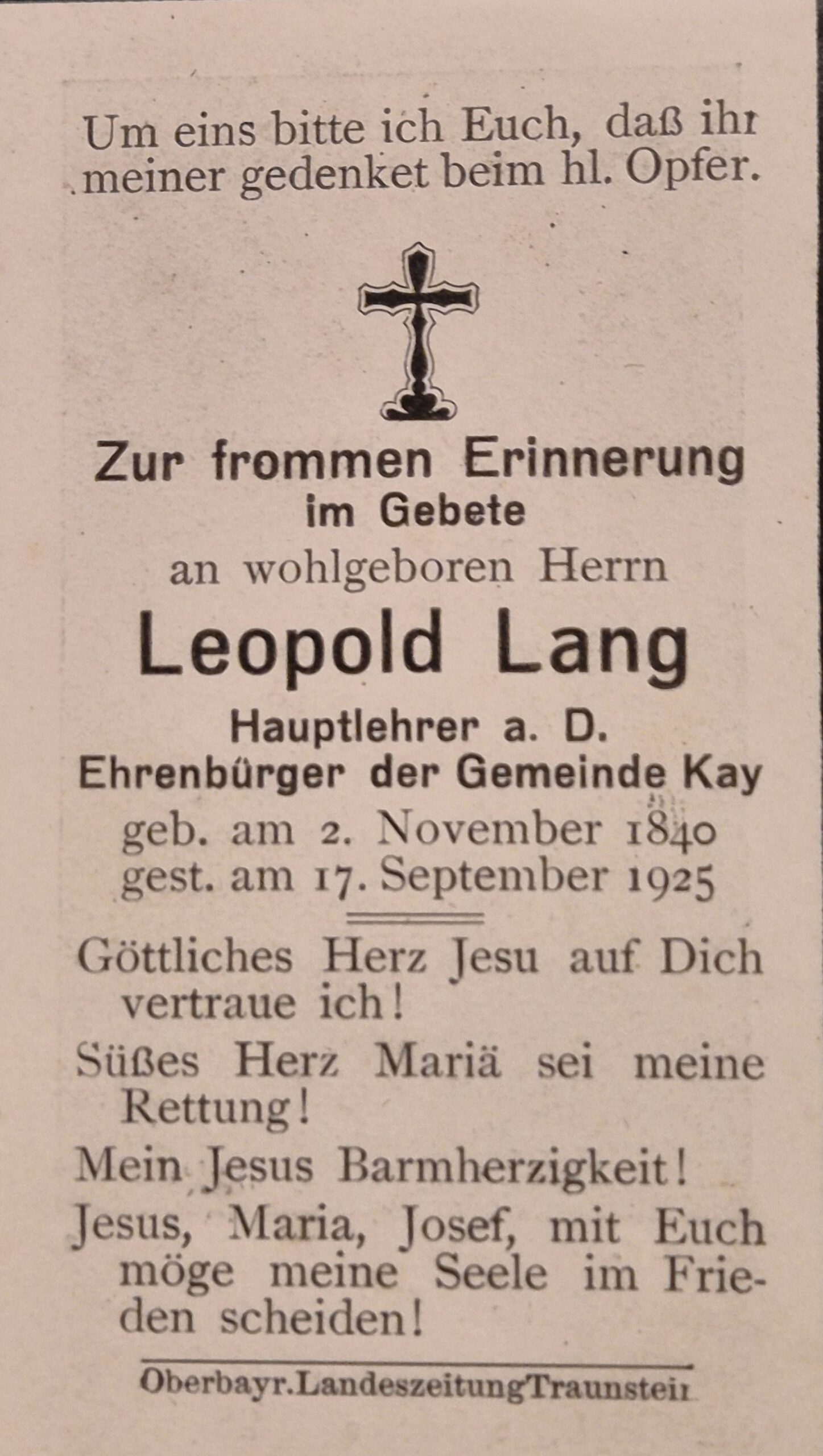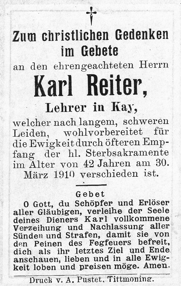 Die Sterbebilder werden von Franz Maier bereitgestellt. Die älteren Bilder sind Teil des Nachlassen seines Onkels Matthias Maier, der lange Zeit Mesner in der Pfarrkirche St. Martin in Kay war und auch die Krippe betreut hat. Wir bitten uns mitzuteilen, falls keine Veröffentlichung gewünscht wird.