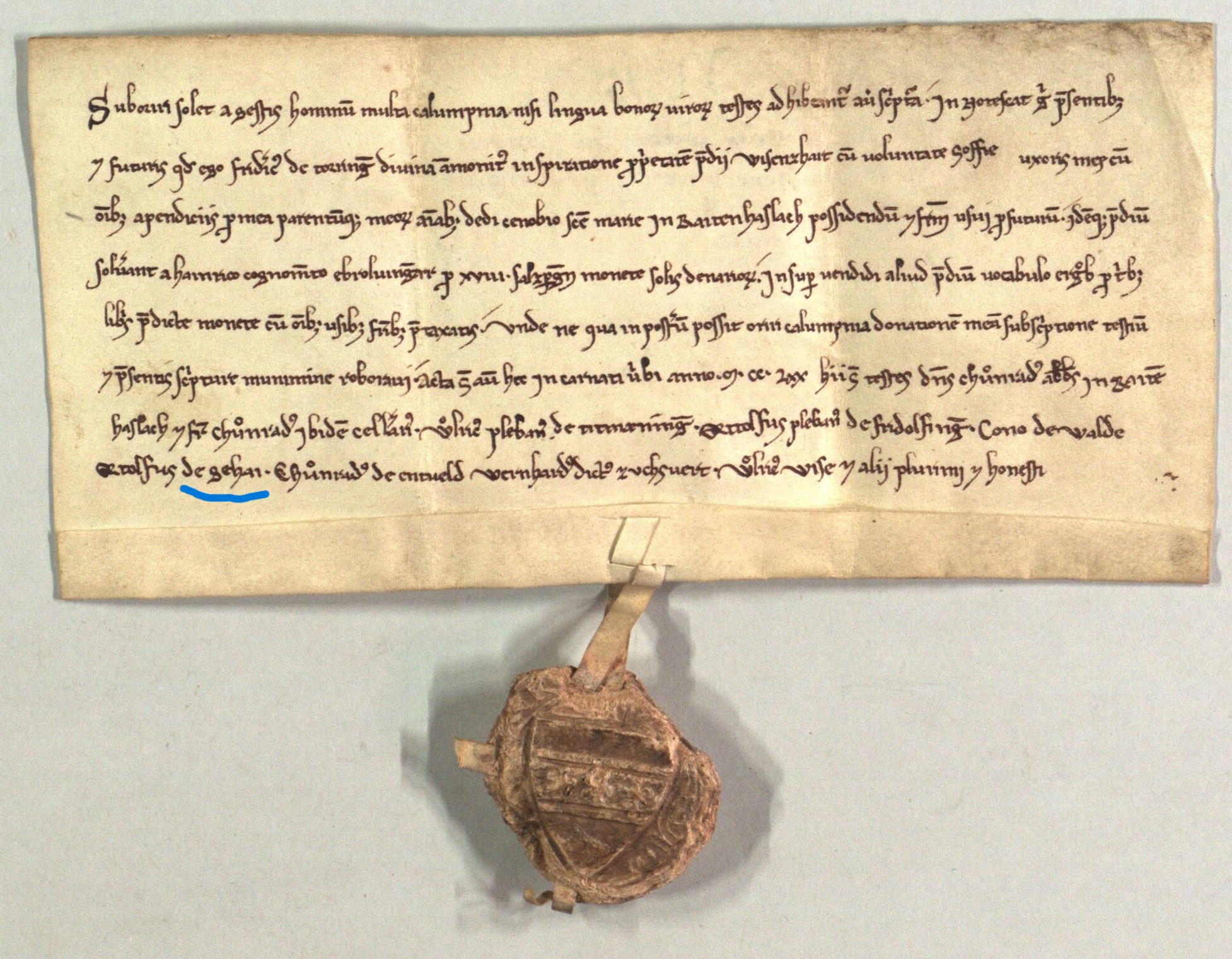 Im Jahr 1313 leistet ein Chunrad der Ghophe von Ghay dem Kloster Baumburg gegenüber Verzicht auf einen Acker zu Keisenherting (?). Ob dieser Chunrad dem örtlichen Adelsgeschlecht angehörte, ist bisher aber unsicher. In einer weiteren Urkunde vom 24. Dezember 1348, taucht der Name Gehay erneut auf. Die Mautner Friedrich Stephan und Johann zu Burghausen veräußerten ihre Veste zu Gehay an ihren Schwager Glan um 500 Pfund Pfennige.