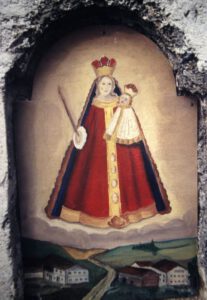 Nach einem Aufsatz von 1936 waren die auf Blechtafeln aufgemalten Bildnisse, Darstellungen des Heiligen Rupert und SL Deratus, einer Kreuzigungsgruppe sowie eines Soldaten auf dem Schlachtfeld. Die Bilder waren bis Ende der 70iger Jahre schon zur Unkenntlichkeit abgewittert. Hans und Anna König ließen daher das Marterl in den 1980iger Jahren wieder herrichten. Die Nagelfluh-Säule renovierte Steinmetz Georg Huber aus Stetten, die neu gestalteten Bildmotive malten die Familie Fuchs aus Fridolfing (3).